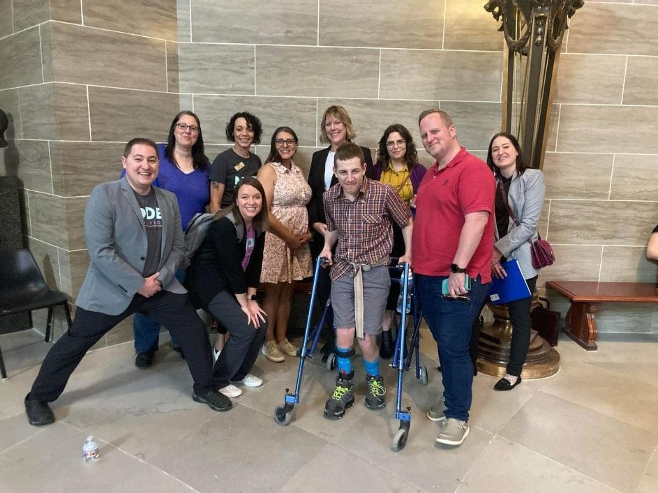 In the photo: MoDE Advocacy Day at the Capitol. Tracey and her husband are in the front left, Jake Wilcott is the self-advocate in the front with the walking aid, and his dad, Josh, is in a red shirt. Elise Moore, their grant writer, is on the far right. This event brought advocates, parents, and self-advocates together. 5 of the people in this picture had never attempted legislative advocacy, and all 5 now actively participate in the legislative process after understanding it and building a relationship with their local elected representative.